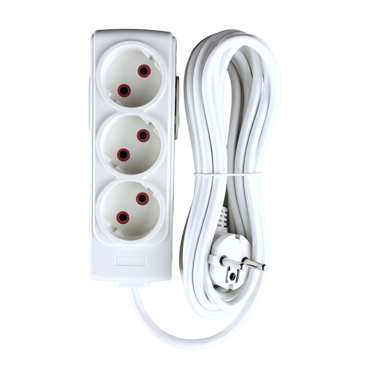 Сетевой электрический удлинитель 5 метров от "MAXIMUM QUALITY TOOLS" имеет 3 розетки на подключение к сети переменного тока. Белый корпус из негорючего АБС-пластика подходит для использования только внутри помещений.