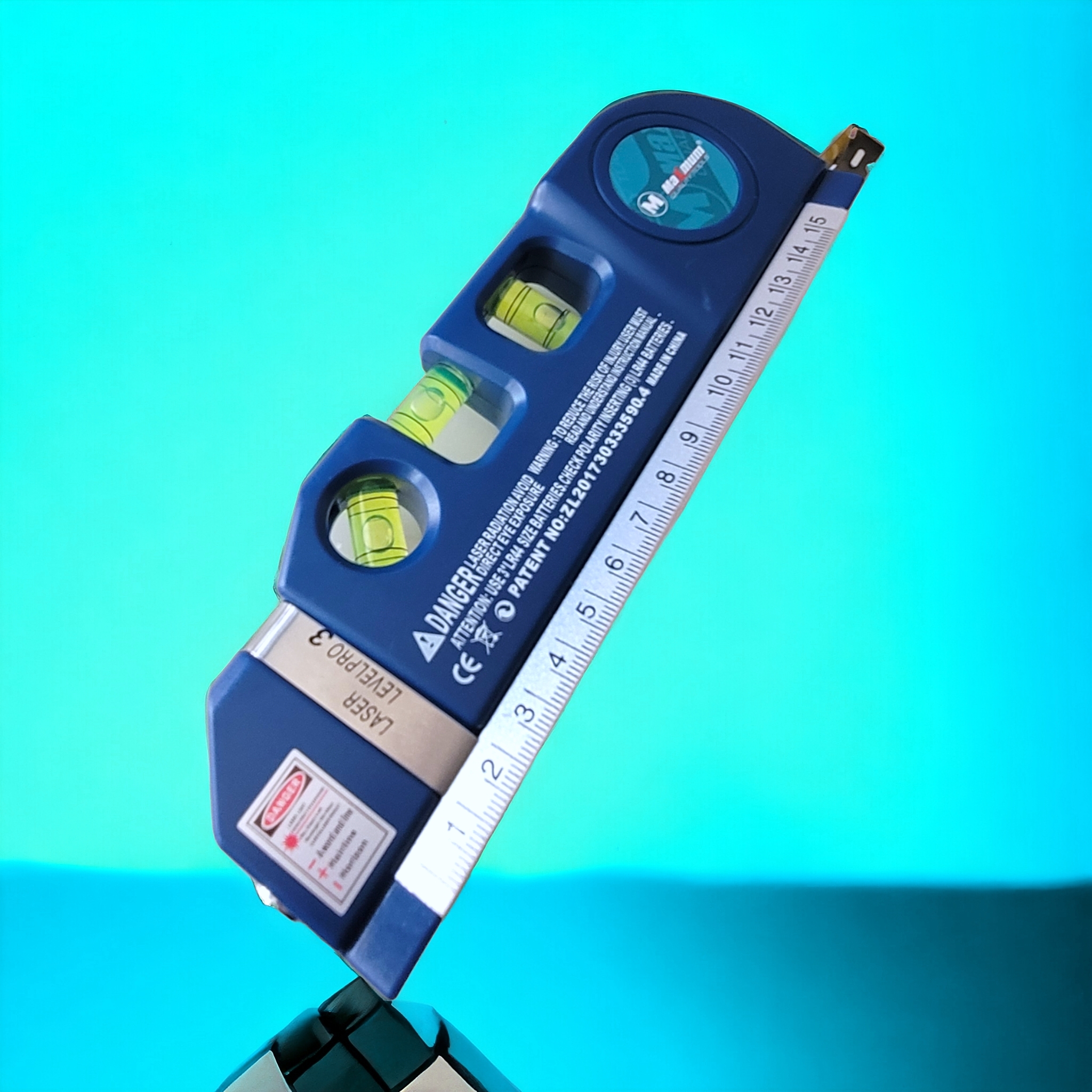 Пузырьковый уровень имеет 3 ярких салатовых глазка, металлическая рулетка встроенная в конструкцию выдвигается на 250 см. Прибор создан из алюминия и покрашен в красный/синий цвет. Основание имеет металлическую линейку 15 см.