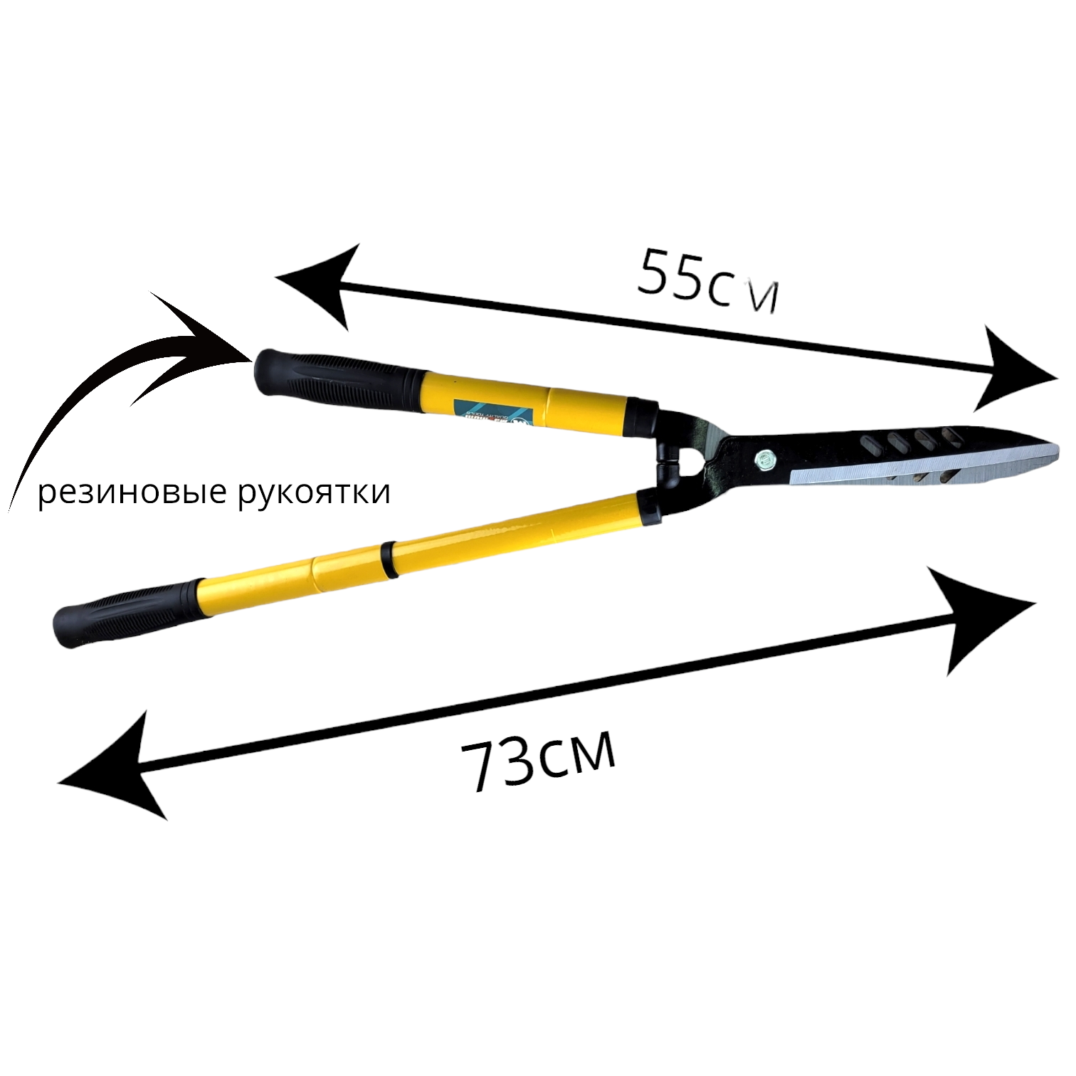 Садовые ножницы с телескопическими ручками раздвигающимися от 55 до 73 см имеют лезвие длиной 20 см, которое раскрывается до 35 см. Лезвие кусторезов выполнено из прочной стали с антикоррозийным покрытием.