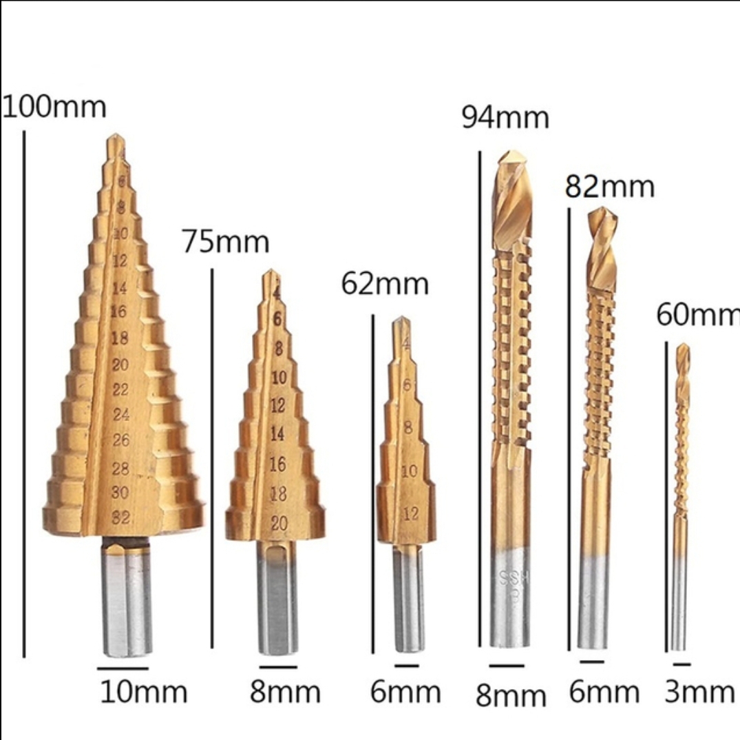 Комплект универсальных HSS сверл «Maximum Quality Tools» включает в себя три ступенчатых сверла и три сверла-фрезы. Ступенчатые сверла из быстрорежущей стали предназначены для различных материалов, включая сталь, латунь, дерево, пластик и т. д.