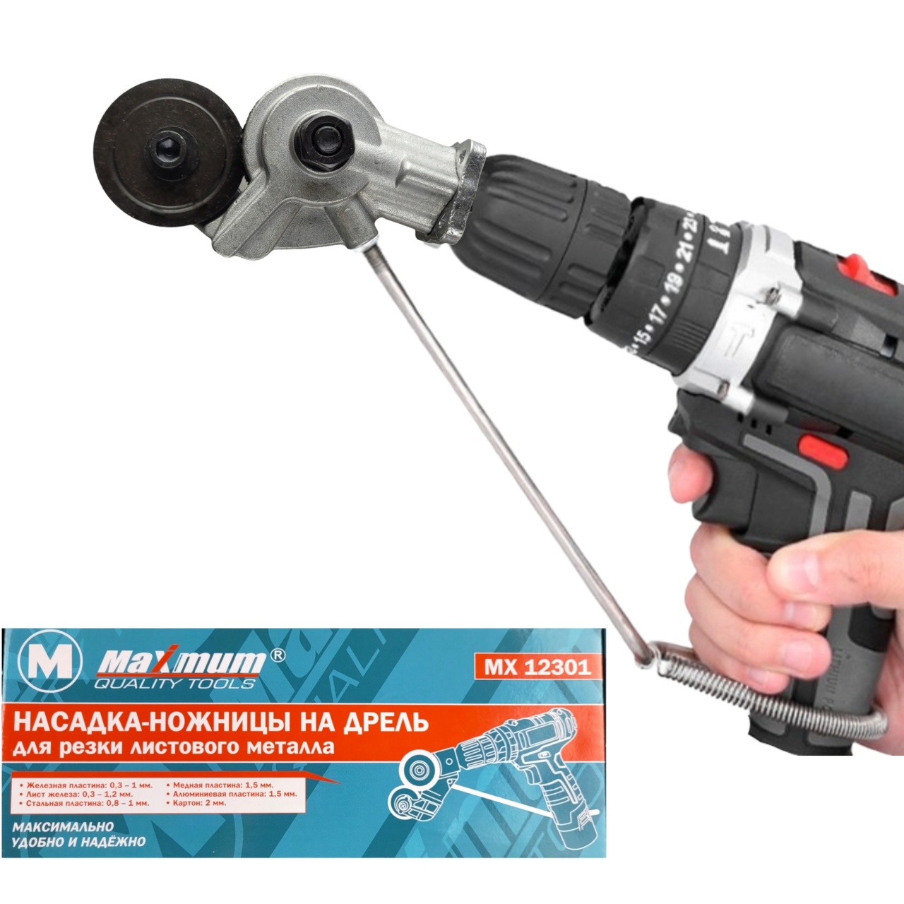 Насадка-ножницы на дрель или шуруповерт для резки листового металла от "MAXIMUM QUALITY TOOLS" используется со стальными заготовками и различными строительными конструкциями.